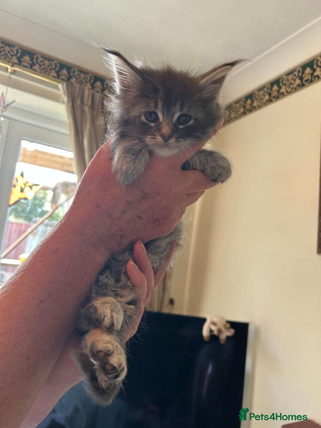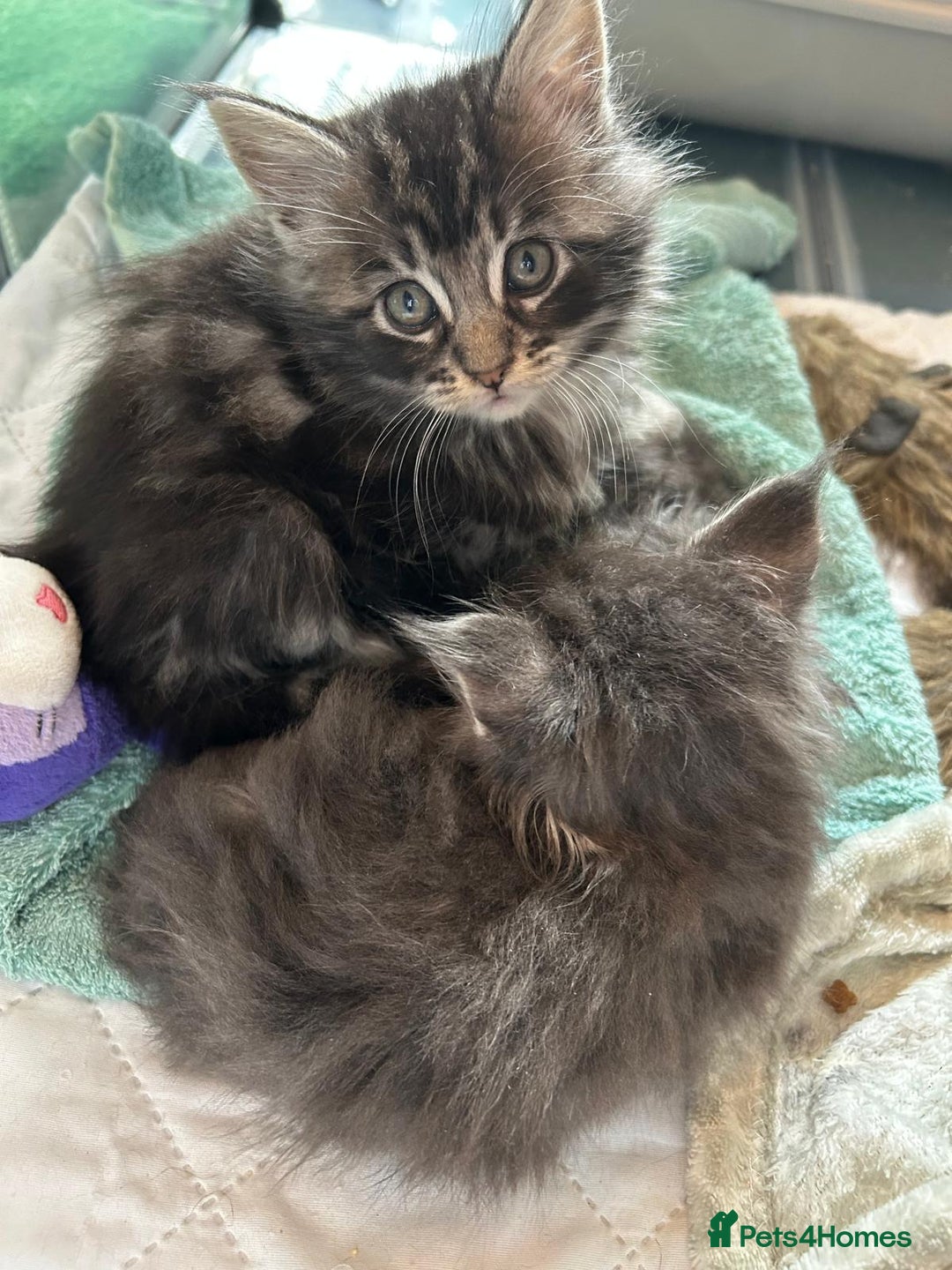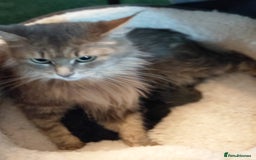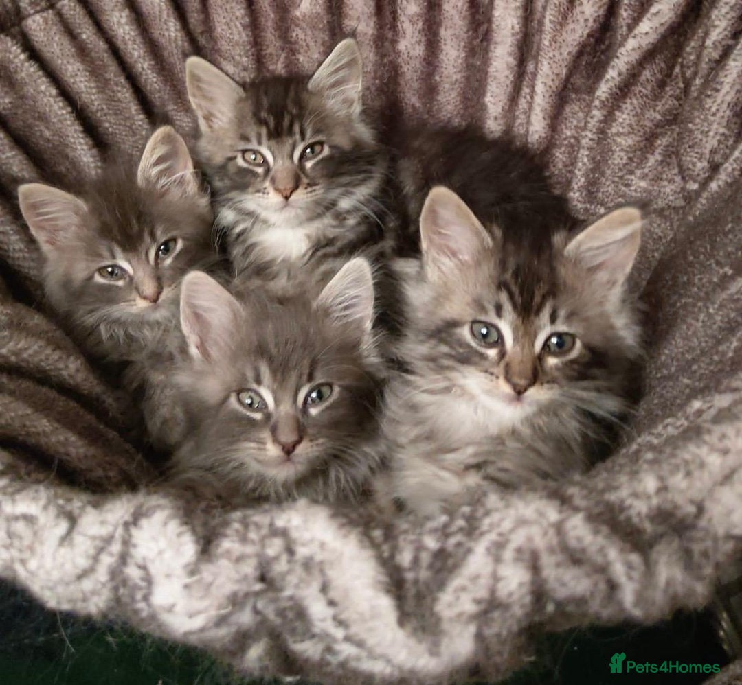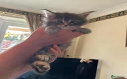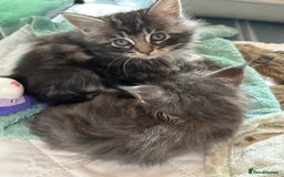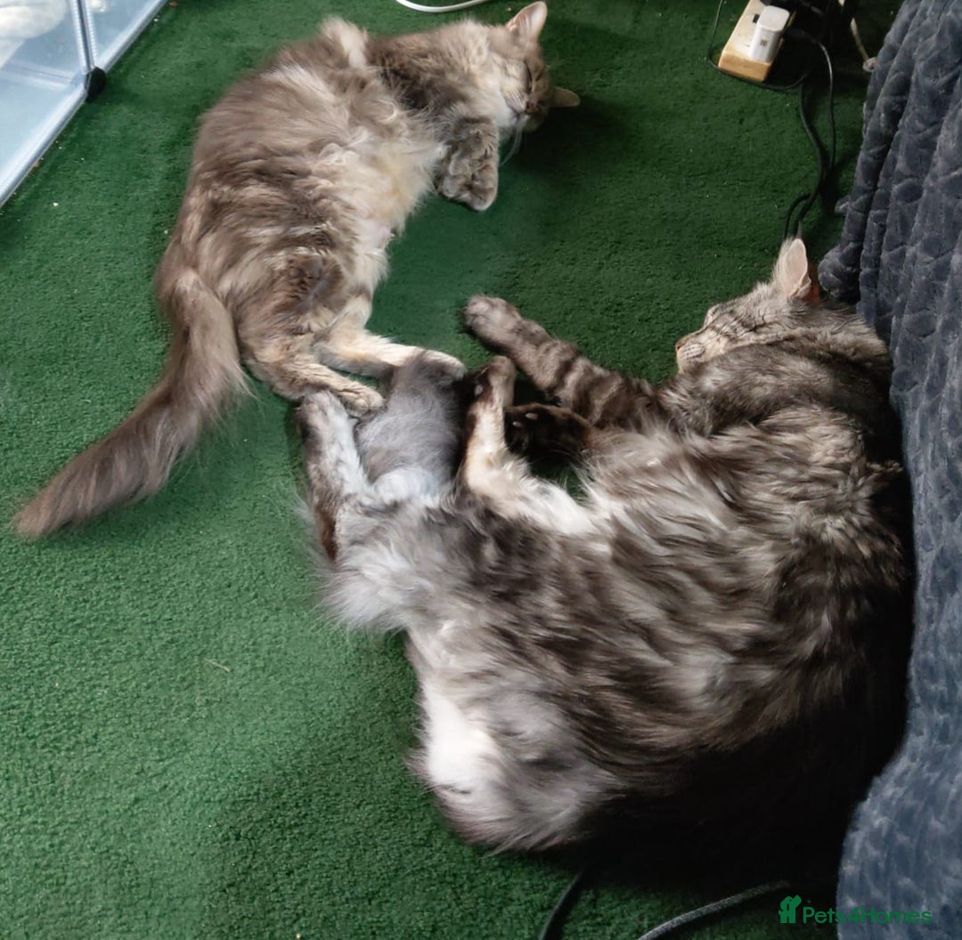 I have 3 beautiful kittens left for sale, 2 boys and one girl born on 11 August 2025 from a litter of 4. They will be available for their forever homes from Sunday 19th October 2025. They have been vet checked and wormed with Panacur and raised in a family home with our other cats who are inoculated every year. 2 of which are their parents which you can meet along with Perseus their older brother. Dad Zeus is a charcoal/snow Maine Coon as is his daughter, and Mum Mia is a Maine Coon / Ragdoll. Blue in colour with hints of snow/silver as are her sons. Both parents are very friendly and loving parents and kittens are fully litter trained and eating well. Viewings welcomed. non-refundable deposit to secure your kitten. Any questions please ask.