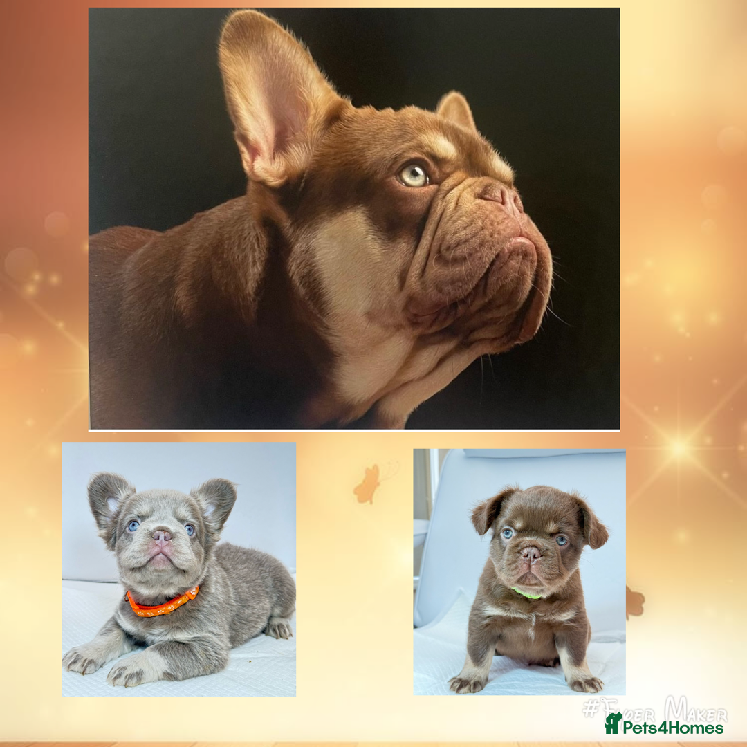 Introducing Lando he is a RARE new shade chocolate and tan carrying blue and FLUFFY with most stunning eyes 😍 with him being a new shade he has higher dna than a rojo. at/at,b/b,co/co,D/d,L/l4🍫🍫🍫🍫 NOW PROVEN😁 ❌no pied ❌no brindle ✅ 2 x tan points ✅2 x testable ✅2 x untestable coco ✅1 x blue ✅1 x fluffy He will 100% pass tan points,new shade chocolate testable/rojo & non testable chocolate to all of his puppies with 50% chance of fluffy Lando will make new shade isabella & full fluffy ( put to the right girl) 🔥 Son of Don frenchies propaganda.Brutus bloodlines you can see what lines he’s from just by looking at him! 🩸 4 panel health tested clear CMR1 clear degenerative myopathy clear HU clear HC clear French bulldog club of England primary tested. He has been throughly tested and graded from nose to tail. there is not many Frenchies out there that have been tested by FBCE I am a registered veterinary nurse. I will be here to give you advice through out the pregnancy,birth and rearing the puppies. I’m not receiving all messages on Pets4Homes so please text my mobile number. message on first day of season to avoid disappointment.