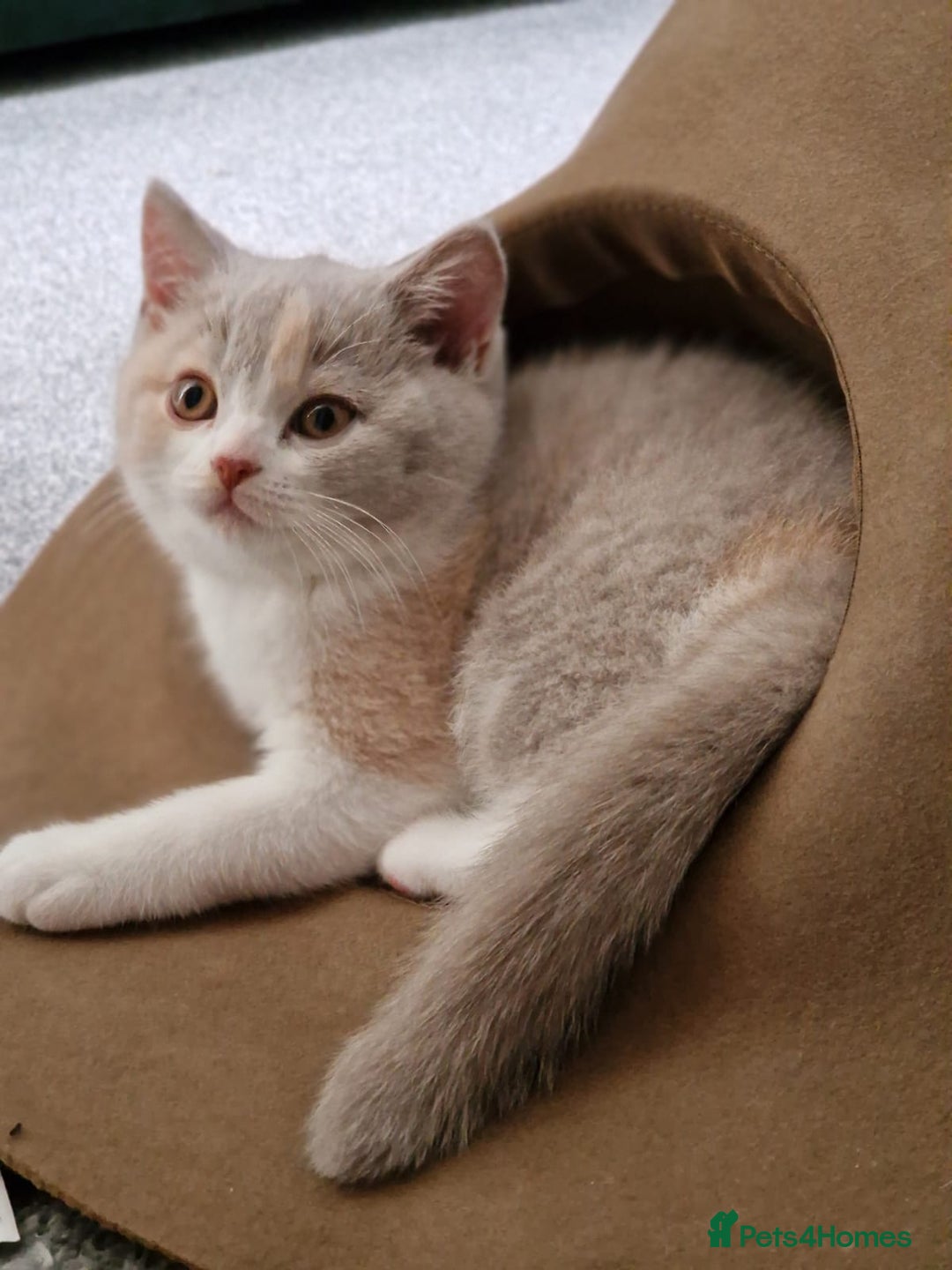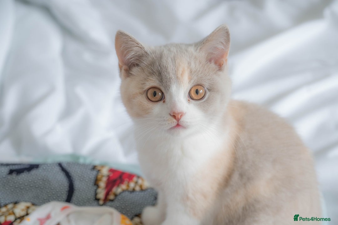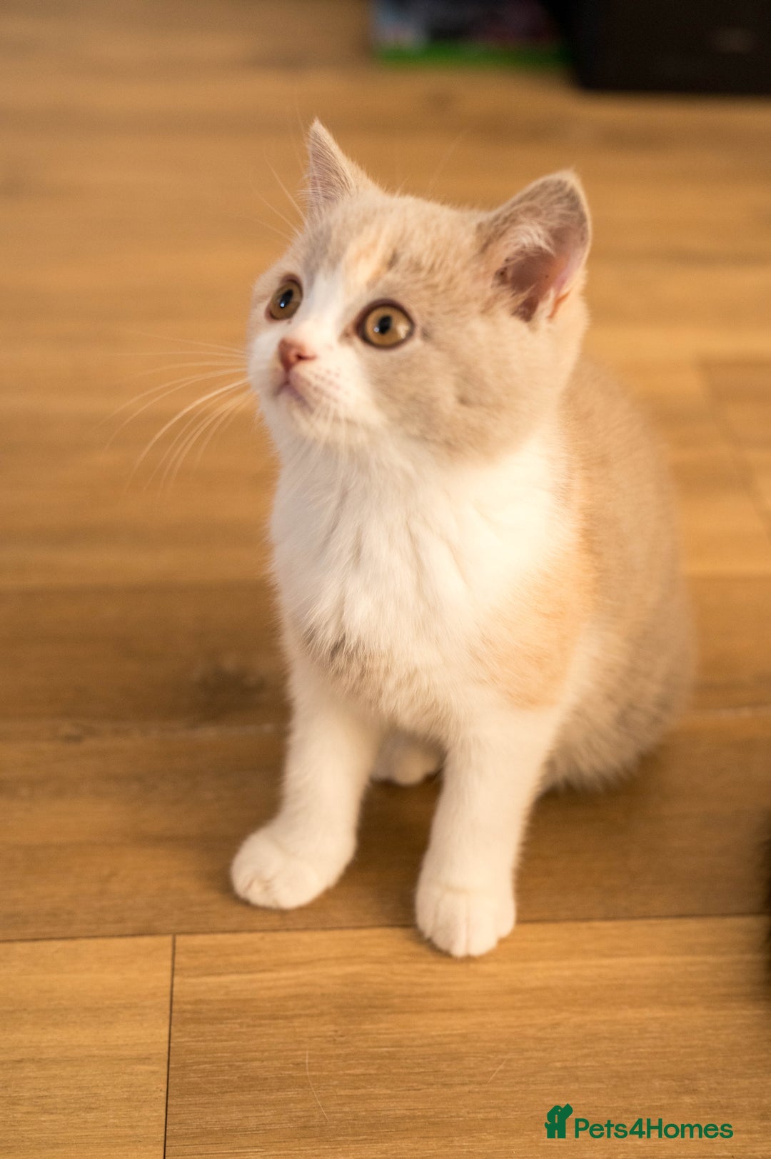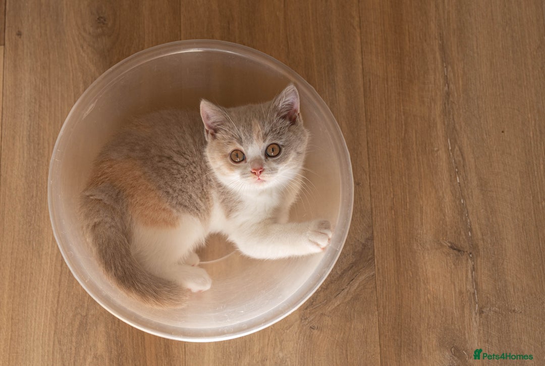 Fully vaccinated beautiful pastel calico female kitten ready to join your home. Feel free to get in touch and ask any questions. Kitten Pearl is super sweet. She has the sweetest dainty trot and loves to play. She'll seek us out for playtime and human company. Her pastel shades are fawn, beige, and white. Such a stunning tri colour British Shorthair kitten who will grow into the most gorgeous cat. 😻 Pearl is available for the right family. She is ready to become part of your loving family. She has been: 🪄 Vet-checked 🪄 Wormed and flea-treated 🪄 Fully vaccinated 🪄 Comes with a kitten pack including her favourite toys and food 🪄 Litter trained 🪄 Lifetime support from us 💖 Don't miss out on the chance to be Pearl's forever home. She has carefully handled from young so is socialised, used to human touch and affection, and is being raised in a very loving home. She is being fed a high quality diet. 😻 Mum and Dad are pedigree British Shorthairs. 🩷 Mummy is the most beautiful and sweetest chocolate brown and white cat. She is super playful and energetic, and is the best Queen caring for her kittens. 💙 Daddy is a very calm and gentle gorgeous ginger, cream and white cat. The kittens definitely have a mixture of Mum and Dad's personalities. No refundable deposit to reserve of £300