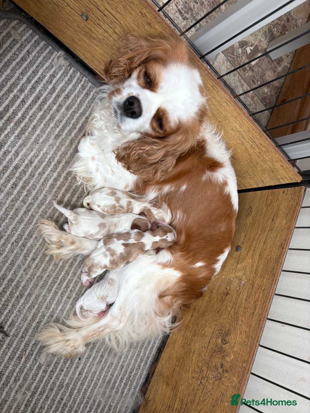 Beautiful Daisy has given birth to 3 girls and one boy this is her first litter and she is a brilliant mum. The dad is a beautiful try. Cavalier called cookie he is 18 months old Daisy the mum is three years old pups will be kept in the house environment Which is also shared by two other Cavaliers. And also a cat face will be micro chipped as well as worm fleet and a fall up-to-date checks. Both parents have no health issues and I’ve been back checked for heart conditions ect please contact me for any further information and also to arrange visits if you are serious about putting a deposit down on one of these puppies