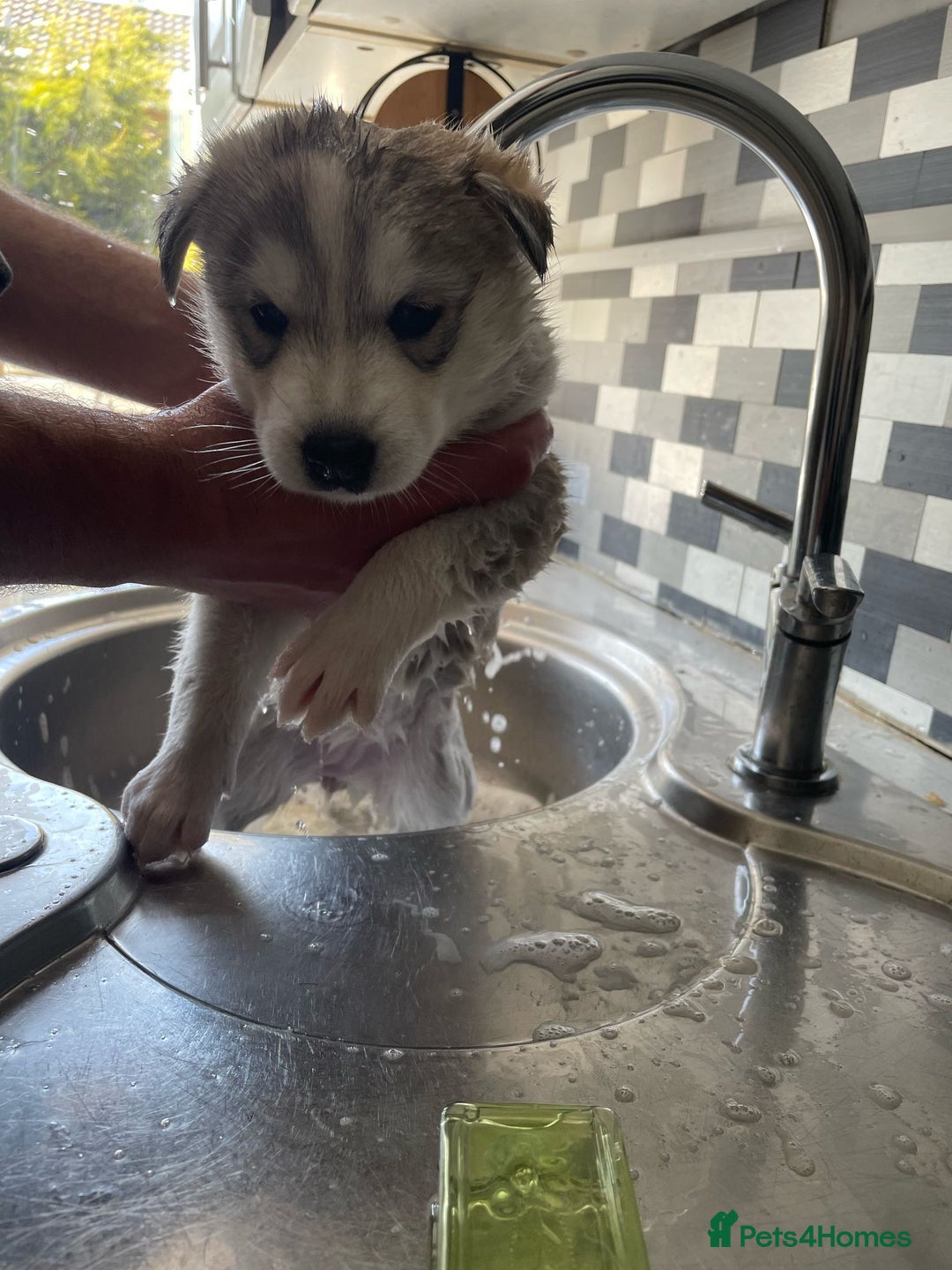 Our beautiful girl delivered 7 stunning puppies all mixed colours (grey, white and sable)4 girls and 3 boys, all blue eyes Parents are pure breed Siberian Huskies, great temperament, brought up with
