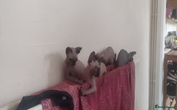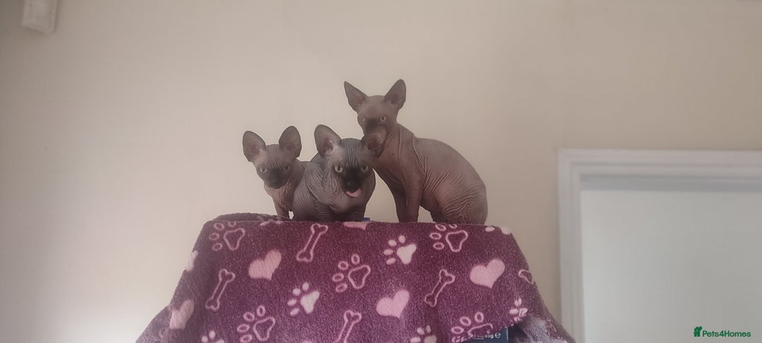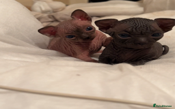 Stunning Canadian kittens, 2 boys and 1 pretty female.Their mum is pedigree and Tica registered Canadian Sphynx .The father is a black pedigree Canadian Sphynx and has a HCM scan and FIV/FELV test done where they all are clear .Mother only can be seeing on viewing.They will be litter trained and will leave us with kitten pack where they will have some wet and dry food,so