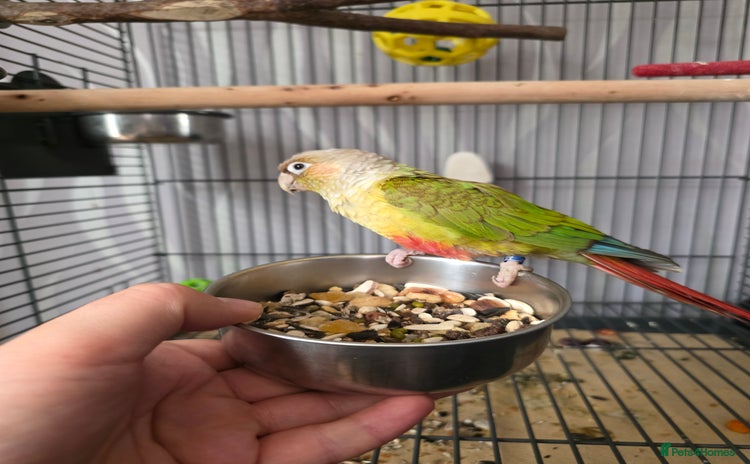 Beautiful bird for sale he is not hand tame spends most of his time outside his cage trying to talk making lots of beautiful sounds. Wings are not clipped. He is on a mixed diet of fruit veg and seeds