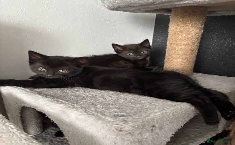 Sweet Pair of Inquisitive Black Kittens Seeking Forever Home! We are sadly needing to rehome this stunning bonded pair of male and black kittens. They are playful, affectionate, and bring so much joy to our home! Approximately 16 weeks old, both are beautiful, sleek black with incredible bright blue/green eyes. One of them has a small white patch on his chest. The Mum i