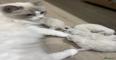 • 4 weeks insurance. • Microchipped. • Health Checked. • Flea treated. • Wormed. • Litter tray trained. • Kitten starter pack • Kitten portrait (jpg) My Queen Winter has given birth to 3 little stunners. 2 boys and 1 girl who will soon be ready for their forever homes. 1 Flame Point boy available. Father is a Seal Tabby Point Mitted Ragdol. He is a GCCF registered