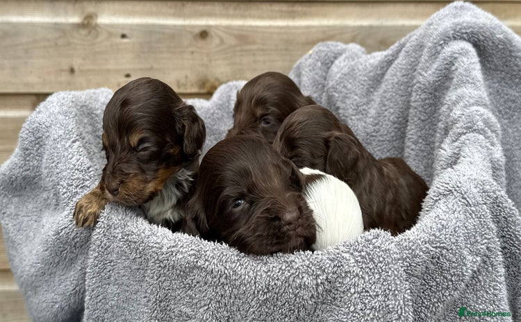Beautiful miniature cockerpoo puppies in merle and chocolate. Our beloved family dog Coco's first litter that she has been devotedly tending are growing up too quickly. The pups will be ready for their forever homes on 31st December. Mum is a working cocker spaniel weighing 10kg. Dad is a toy poodle weighing 3kg. Both parents are health tested. The puppies will be micr