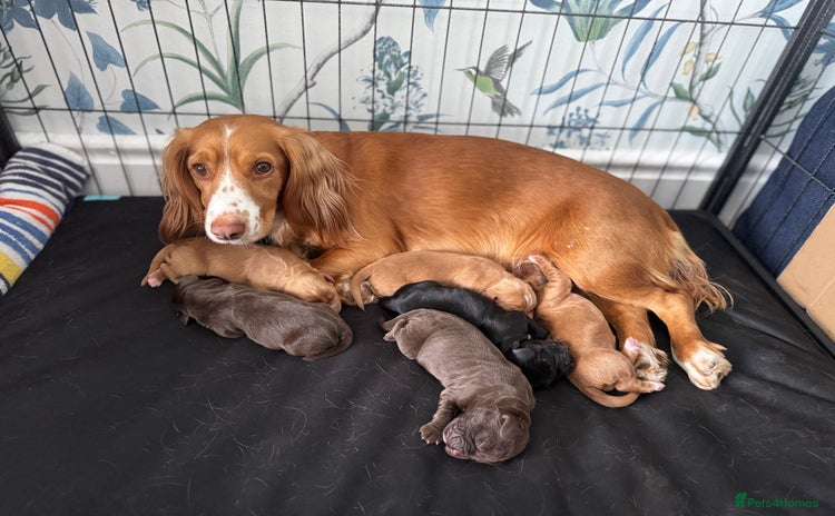 hi our beautiful girl Honey has had a gorgeous litter of cocker-spaniel puppies 1 boy and 4 girls soon they will be ready to start looking for new homes they are all healthy,happy,playful puppies all with there own personality's that have started to really shine through we have some lap dogs and some more adventurous puppies they have been raised in a family home so