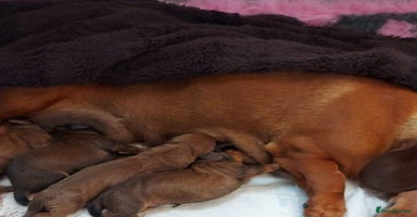 Lovely litter of standard dachshunds from our pet Ruby and the beautiful Woody .. 1. Chocolate and tan boy 2.Chocolate boy 3. Black and Tan boy 4. Red girl