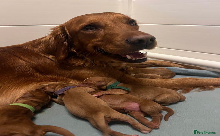 ((2 BOYS AVAILABLE))We are ⭐️⭐️⭐️⭐️⭐️ council licensed breeders!! Harley has given birth to the most adorable dark red puppies. Harley is the most affectionate loving girl who is always willing to please. Hips-3/4 Elbows-0/0 Prcd-PRA-clear Dad Henry is a working Golden retriever who also has the best temperament. Hips-6/6 Elbows-0/0 PRA 1&2-Clear Prcd-Clear ICT-Clear
