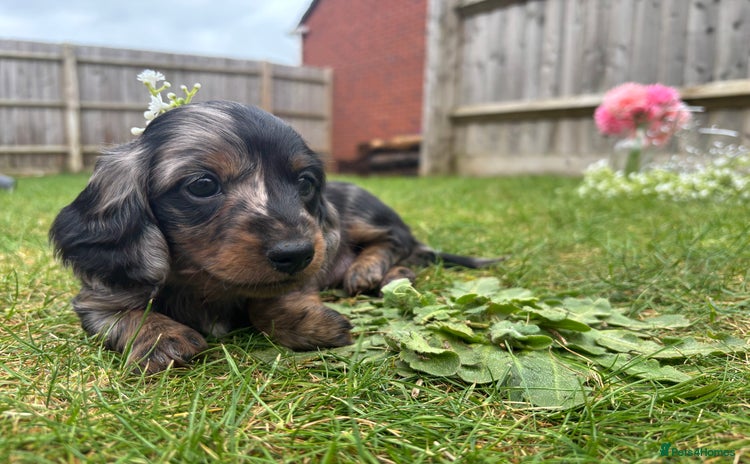 Hi our beautiful miniature dachshund has given birth to 6 adorable babies there’s 2 girls and 4 boys they are blue dapple in colour with beautiful patterns they have been vaccinated with the second vaccine already paid for in advance they been microchipped regularly worm and flea treated they’ve been brought up in our family home with young children very playful and cute c