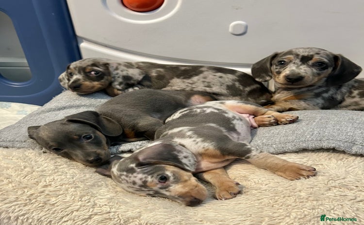 I have 4 beautiful miniature Dachshunds for Sale. 1 Isabella boy, 1 Isabella girl, chocolate dapple girl and chocolate boy MOTHER is a family dog and KC reg and Father is a friends Dachshund. Father i