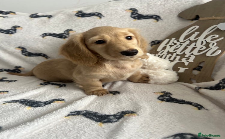 Ready to go to new loving homes now. 6 Quality Cream Longcoat miniature dachshund puppies with soft silky coats and amazing pigment. These puppies and their parents are Cream which makes them rare. They are not shaded cream. Puppies will come with a family tree but are NOT kc registered and sold as pets only. 4 Girls and 2 Boys in this stunning litter 3 Cream Girls a