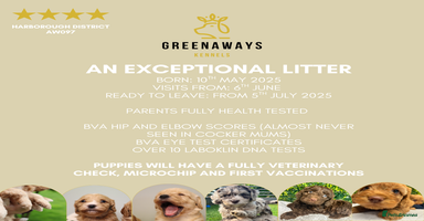 Hello and welcome to Hounds of Harvington! Our lovely Maggie has given birth to a litter of beautiful and healthy Cockapoo pups. Maggie is a Cocker Spaniel from show lines and has been gun dog trained, she is four years old and this is her first and ONLY litter as she is strictly a pet. She has the most loving personality and very sweet. She is KC registered and has exce