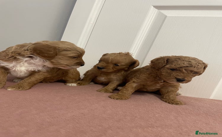 UPDATE ONLY RED GIRL, BLUE GIRL AVAILABLE NOW Our beautiful girl red has had her first litter of cocker poodle puppies on the 4th October 2 boys and 3 girls how gorgeous are they will be ready to rehome by 4th of December. Mum is a full working cocker spaniel who we have had since she was a puppy herself she is very calm and loving dad is a friend's full poodle with the