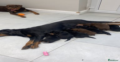 **Black boy SOLD** Here we have a gorgeous little of 7 pure breed Rottweiler puppies. 4 girls & 3 boys. Both mother and father are our beloved family pets, both KC registered and can be viewed with the pups. These beautiful babies are handled daily by both adults and children. They will be vet checked, wormed/fleed, first vaccine and chipped ready to go to their forever