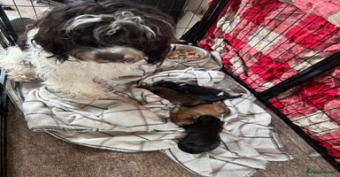 We have 4 F1 shihpoo babies available for their forever families. They were born on the 24th of octover and can leave us from 19th december. 💙 3 boys ❤ 1 girl 1 black boy -£950 1 choc boy -£950 1 silver merle boy with a rare natural bob tail -£950 1 white choc merle girl -RESERVED mum is our family shihtzu "pria" she is a real little sweetheart and follows me everywher