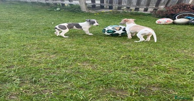 Update 10/12/25 Ready to leave. Vet visit and 1st vaccine done today. All in good health 3 females available 3 males available. We are proud to announce the birth of nine beautiful puppies 5 female, 4 male. Their colouring is blue brindle and white. Both parents are soft in temperament and owned by us. Each puppy will vet checked with certificate, microchipped and receive