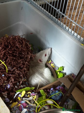One albino-juno One black and white-rocky They are lovely, and have been so great to have, but need to rehome as i am getting a cat. Rats will be free; but i will be separately selling the cage and a